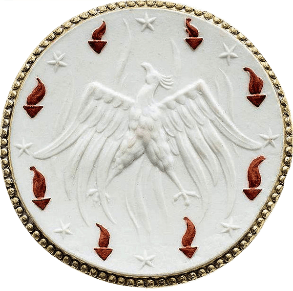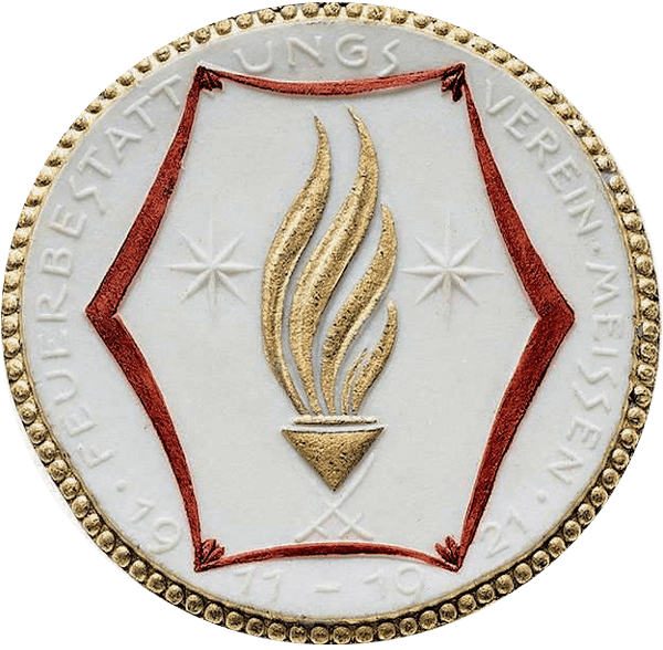 In der Porzellanmanufaktur Meißen war durch die anhaltende Knappheit von Metallgeld um 1920, ein völlig neues Produkt geschaffen worden, welches auch große Beachtung fand und sogar vor dem damaligen Reichstag diskutiert wurde. Das Porzellangeld. Obwohl es sich als „Notgeld“ in Münzenform für das Deutsche Reich dann doch nicht durchsetzen konnte, gab es Münzen aus Böttgersteinzeug® (nachfolgend Steinzeug) und Biskuitporzellan in vielen deutschen Städten und im Lande Sachsen. Neben Notgeld wurden natürlich auch Plaketten und Medaillen hergestellt. Im Gebäude, das im Manufakturjargon noch heute als „Rote Münze“ bezeichnet wird, fand man für das Anliegen des Feuerbestattungsvereins ein offenes Ohr. Hier arbeiteten große Künstler und diese brachten ihre genialen Ideen und Entwürfe auf die Größe einer Münze. Einer aus dieser Zeit war Emil Paul Börner (1888-1970), der sich dieser Aufgabe annahm und die beiden Motivseiten entwarf.