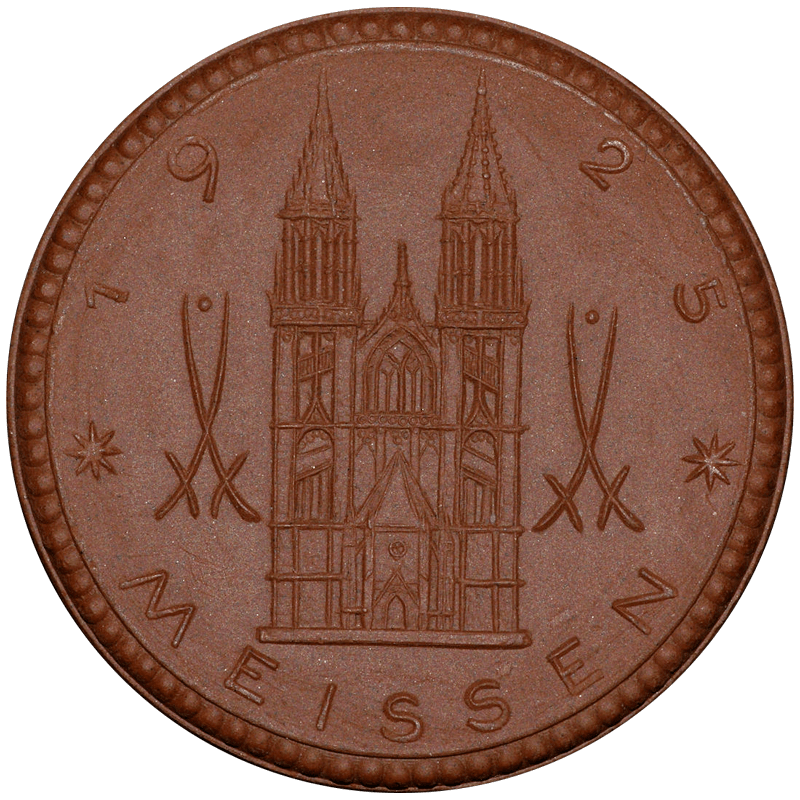 Beschreibung Rückseite: Die beiden Westtürme vom Meißner Dom. Links und rechts je ein achtstrahliger Stern und die Kurschwerter der „Pfeifferzeit“, mit dem Punkt zwischen den Klingenspitzen. Umschrift oben: 1925. Umschrift unten: MEISSEN.