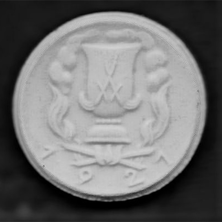 Rückseite: Auf einer gebogenen Halbkreislinie steht eine Putte mit Weintraube. Rechts die Kurschwerter. Unten steht halbkreisförmig «1921».
